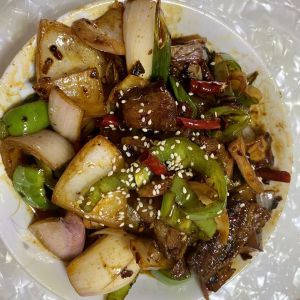 倒入洋葱,二炮椒,白胡椒粉少许,蚝油少许继续煸炒3分钟