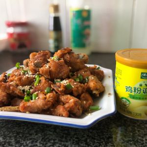 把鸡腿丁炸至金黄色后捞出,升高油温,复炸20秒,捞出沥油待用