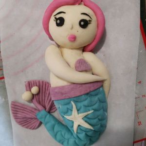 揪三个小面团,加入自己设想的头发颜色,鱼鳞和尾巴颜色色素或者果蔬粉揉匀备用。