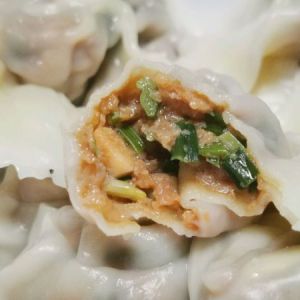 一起装盘,打入两只鸡蛋,放入生粉,各种调料适量,加入韭菜根茎碎