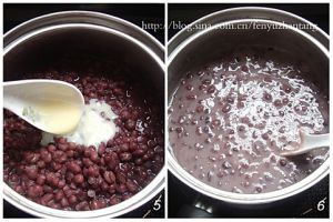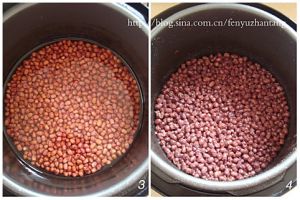 泡好的红豆放入电高压锅中,放入水,水的量为没过红豆约0.5厘米,压30分钟。排气后,将电高压锅打开,可以看到红豆已软绵,但还保持粒状。