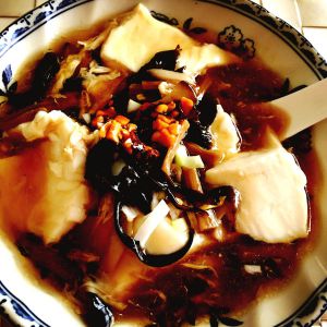 把卤浇到蒸好的豆腐上,撒上小葱末,加上花生碎就可以吃了