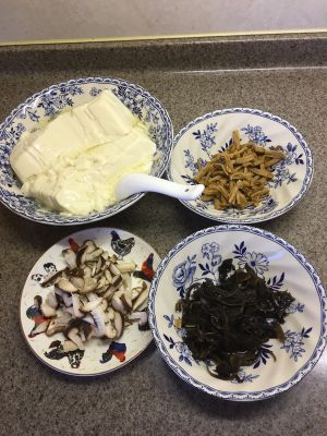内脂豆腐三块上锅蒸;黄花木耳香菇切段