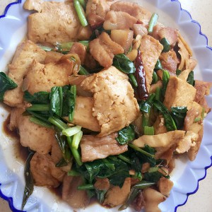 配菜有五花肉切片,葱切马蹄,姜切丝,蒜切成片,干辣椒切段