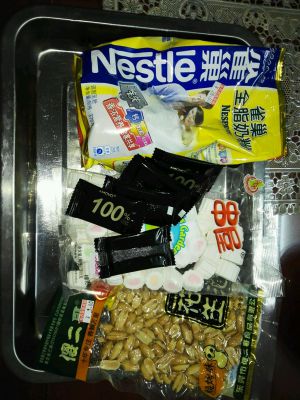 奶粉,花生,葡萄干,称好准备。