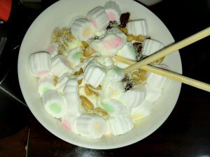 棉花糖放微波炉,高火一分钟。然后和热巧克力,以及其他配料一起搅拌均匀。如果觉得不够软,就再微波半分钟。