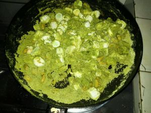 不用微波炉也行。用不粘锅,融化黄油和棉花糖,再加入配料。图例是在做抹茶味道的。10~15克抹茶粉。