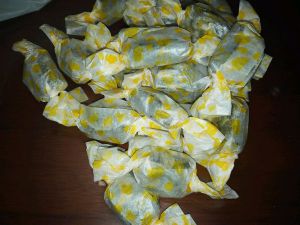 糖块略微晾凉,切块,包装。如果晾得过了,糖块变硬,不好切,就再微波加热一下,软点就容易切了。