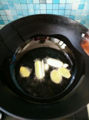 锅里放油按照自己的肉量有多少放多少油,不然浪费,油不要烧太热,放进葱段和姜片和两瓣蒜,小火炸,炸至葱姜蒜焦黄捞出。