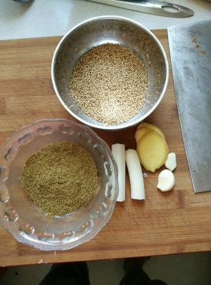 我用的生芝麻,需要自己炒熟,如果家里有熟芝麻最好,因为芝麻不好炒制,容易糊,我用最小火炒了三分钟,锅别烧的太热放芝麻,要不停的翻炒。然后把孜然和花椒面放进锅里炒两分钟,有香味儿出来就行了。