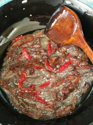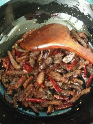 炸到你觉得肉发硬了,放干辣椒皮,继续炒制。
