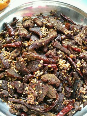 我喜欢有嚼劲的牛肉干,就炒的时间长一点儿,我炒的这个就有点干,超级有嚼劲,如果大家不喜欢太干就多留点儿油,炒制的时间缩短,就大功告成了。