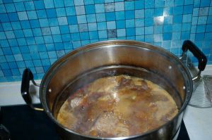 放进卤水中卤制四十分钟,注意别卤时间太长,以免肉煮太烂影响嚼劲。