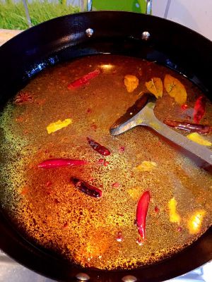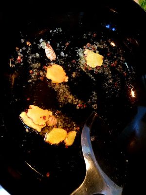 放油炸花椒和姜片,然后倒入冰糖炒化