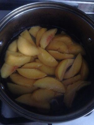 煮开后转小火,煮15分钟左右,煮到用筷子可以轻松穿透黄桃为宜。关火再焖一会(时间根据黄桃块大小自主调节)