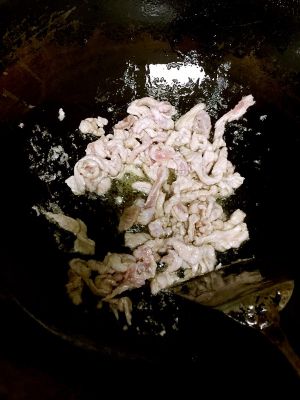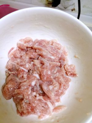 锅烧热放油。滑油后即刻放肉。这样肉可以很容易拨开而且不老。肉滑到变白就可以了。