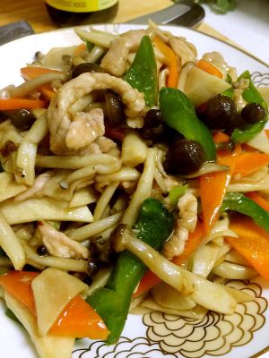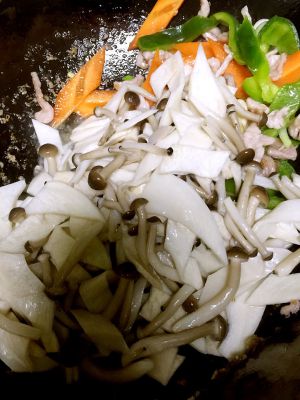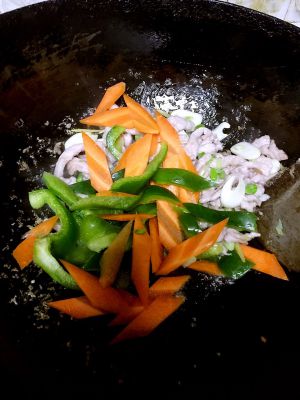 肉变色后放葱姜蒜(倒呛锅)。然后放配菜翻炒几下断生。