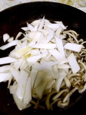 接着放蘑菇。继续翻炒几下。放适量蚝油、盐、黑胡椒粉调味儿。翻炒至汤汁浓稠。出锅前放鸡精。装盘。