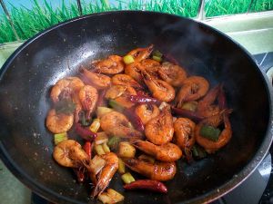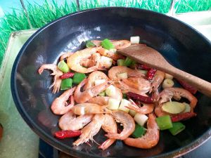 锅里放入适量菜油,五成热放入姜葱干辣椒,小火煸炒几十秒,放入备好的虾,转大火炒一分钟