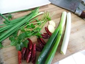葱、姜、香菜洗净改刀,干辣椒洗去灰尘,而且炒时不容易糊,老妈传授的经验