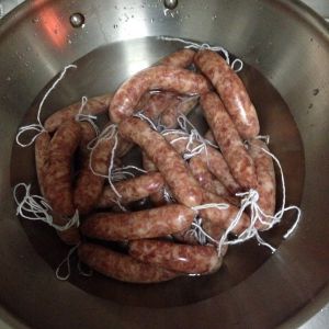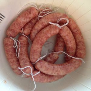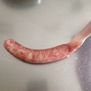 因为是手工灌制,将羊肠衣套在专用漏斗上(网上有卖)