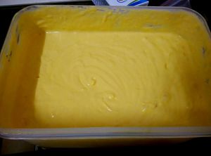 芒果糊和奶油混合均匀放冰箱冷冻层(结冰的那层)半个小时拿出来用打蛋器搅拌一会,搅拌二三次就可以吃了!吃之前拿出来放保鲜室半小时回软