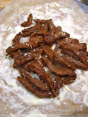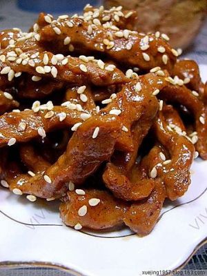 锅里倒入热油,把牛肉条炒熟,用水淀粉勾芡,出锅淋上白芝麻。