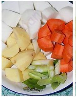 将胡萝卜,水萝卜,土豆,白菜切成小块备用。