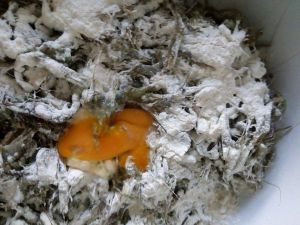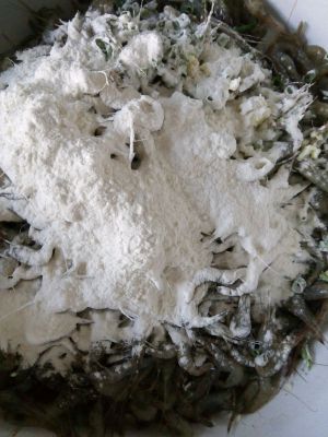 再在面粉上洒一点盐后放入生姜沫、葱花进行充分搅拌均匀以面粉能薄薄一层裹住小虾为宜。
