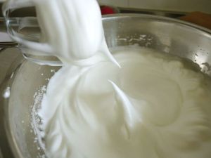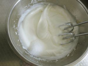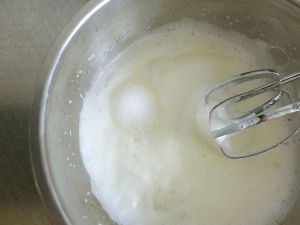 继续打发至硬性发泡(用打蛋器提起蛋白,蛋盆里的蛋白和打蛋器上的蛋白均呈直立无弯曲尖状);