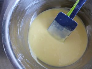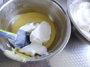 取三分之一蛋白加入蛋黄糊中,用橡皮刮刀从蛋黄底部向上翻动,搅拌均匀;