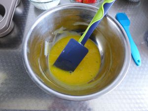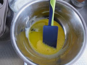 将葡萄籽油倒入蛋黄液中,搅打均匀;
