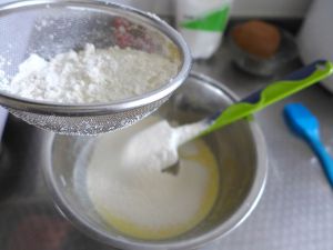 将低筋面粉提前过筛2次,然后再次过筛后加入蛋黄液中;