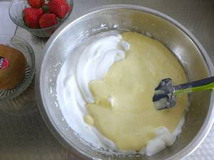 将剩余蛋白加入蛋黄糊中,从底部向上翻动搅拌均匀;