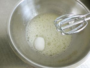 蛋白用电动打蛋器打出大泡后,第一次加入三分之一的砂糖;
