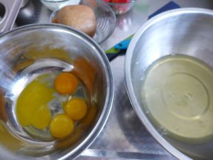 将蛋清和蛋白分离,装在2个较大的盆中(装蛋白的盆要非常干净,不要有油或水);