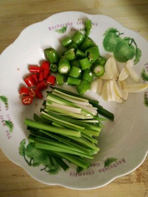 青椒,小米椒,韭菜洗净切段,蒜切片备用