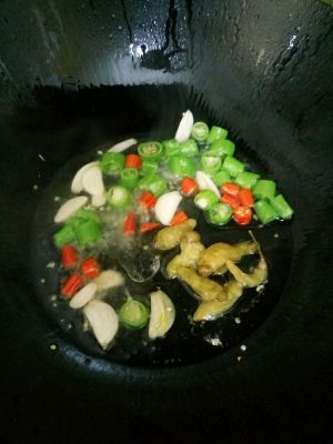 锅中放油,热至七、八成热放蒜、青椒、小米椒、泡椒煸炒