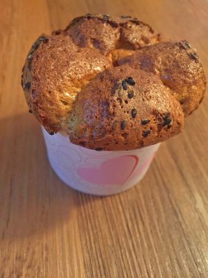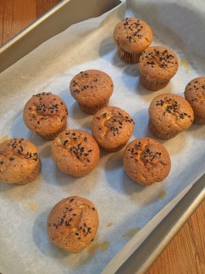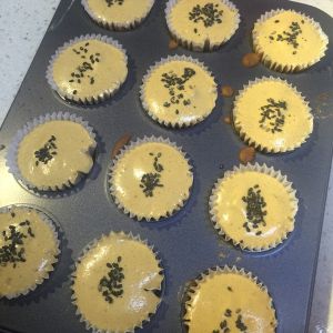 把蛋糕糊装到大号裱花袋,挤入杯子当中,表面可以撒上芝麻,也可以忽略这一步,根据个人口味。烤盘震几下,烤箱预热10分钟200度,再把蛋糕入烤箱,温度调至180度上下火烘烤15-20分钟。