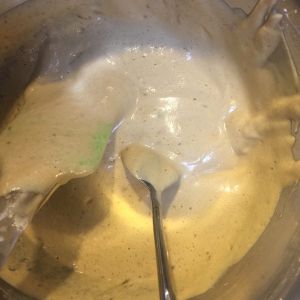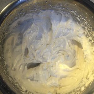 分三次将打发好的蛋白霜加入面糊当中,上下翻动,不要画圈,会消泡。