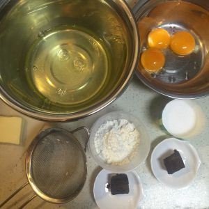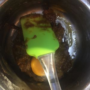 1、35g水加红糖B快速加热融化搅匀,再加入玉米油加热至混合物温度上升,再加入红糖A搅拌均匀。注意,我用的是小砖块红糖,所以我必须要小火加热煮一下糖才会化开。用红砂糖的话可以在加入红糖A那一步使用隔水加热。