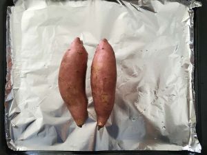 红薯尽量选择大小均匀的,因为在烤制过程中也会同时熟。将红薯清洗干净后放在烤盘上,烤盘铺上锡纸,这样烤红薯时流出的红薯油会滴在锡纸上,不容易弄脏烤盘,以方便清洗。在购买红薯时尽量挑选外表光滑干净的、锤形的红薯。已经发芽的或是表面有黑斑的红薯不要购买,发芽的红薯和表面有黑斑的红薯食用后会使人中毒。