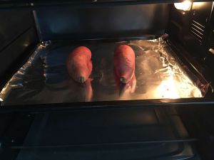 烤盘放入烤箱中层,210度烤60分钟左右。各家烤箱功率大小不一,烤制时间仅供参考。大家也可以在烤制过程中看几次烤箱里的红薯状态,小心的用手指按几下,一般比较容易按下去,红薯内部就熟了。红薯一定要烤熟透在吃。