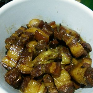 肉丁控水后放入炒好的糖色中,翻炒五分钟左右,使肉上色,如果颜色淡,可加少许酱油