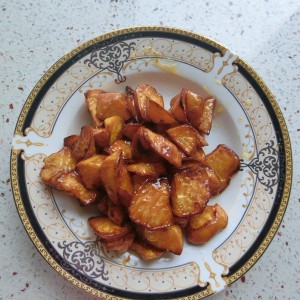 糖熬好,下炸好的地瓜,马上翻腾,要快,要不然就糊啦,最后关火,盛盘,成功啦。
