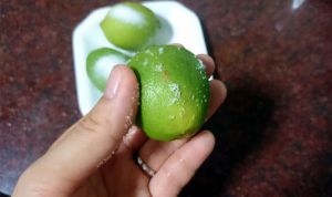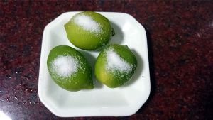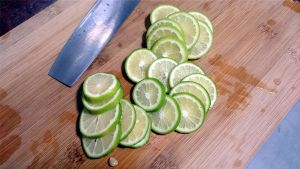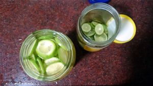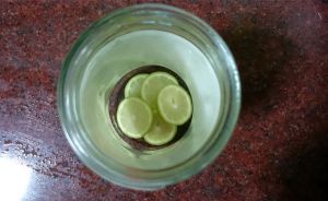 玻璃瓶用沸水消毒,然后铺放入一层柠檬片。