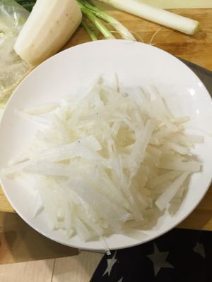 倒入开水再放入萝卜丝和大葱丝,大火五分钟中火十分钟小火半小时