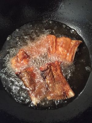 下锅炸,需要炸硬一些,在后面的过程中鱼不至于太碎