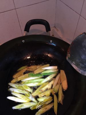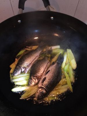 半小时后,凉油下葱姜,稍稍煎一会,鲫鱼用纸吸干周身水分