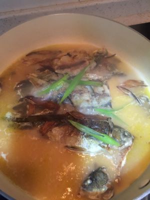 两面煎黄后,加水(高汤更佳)炖煮,直至鱼汤雪白。